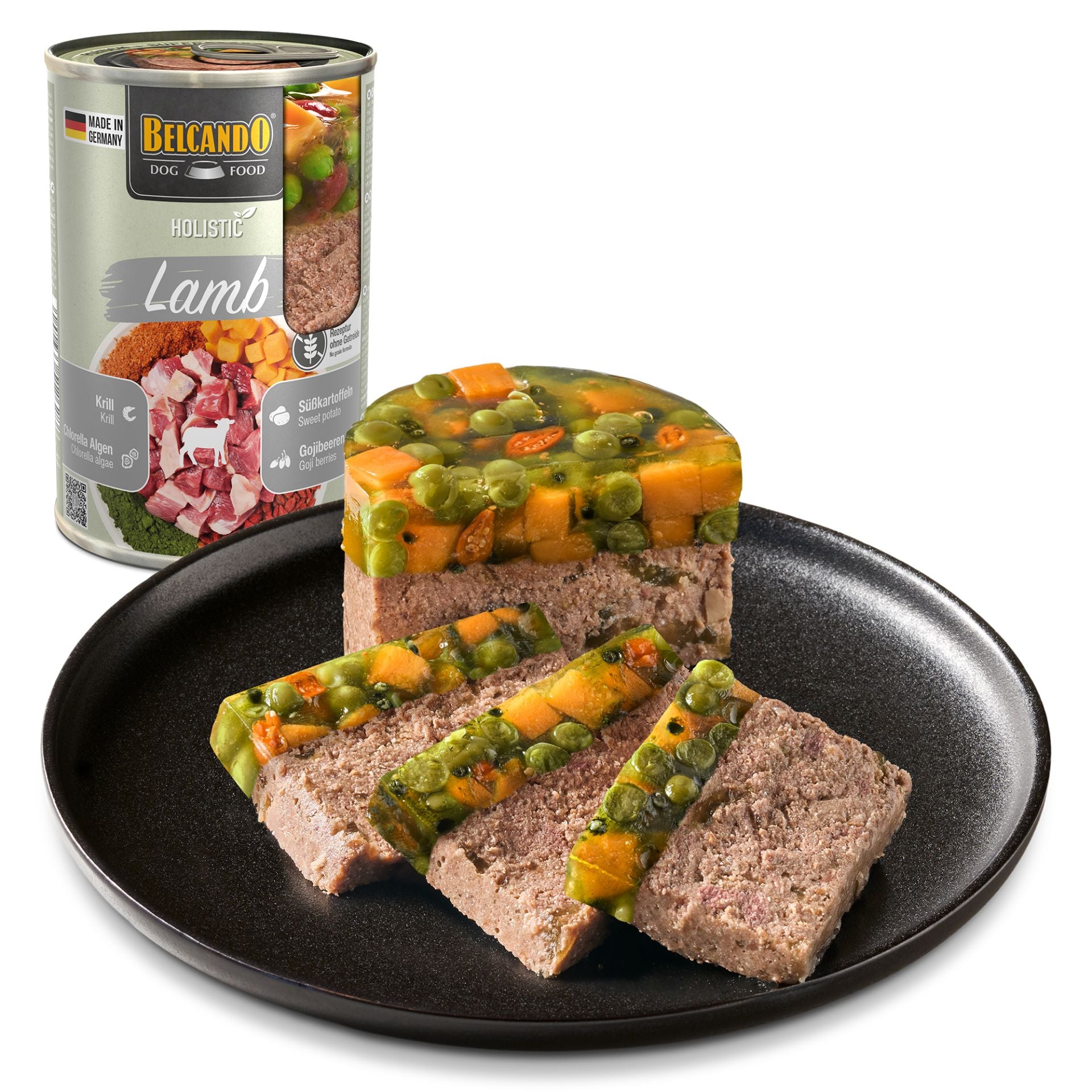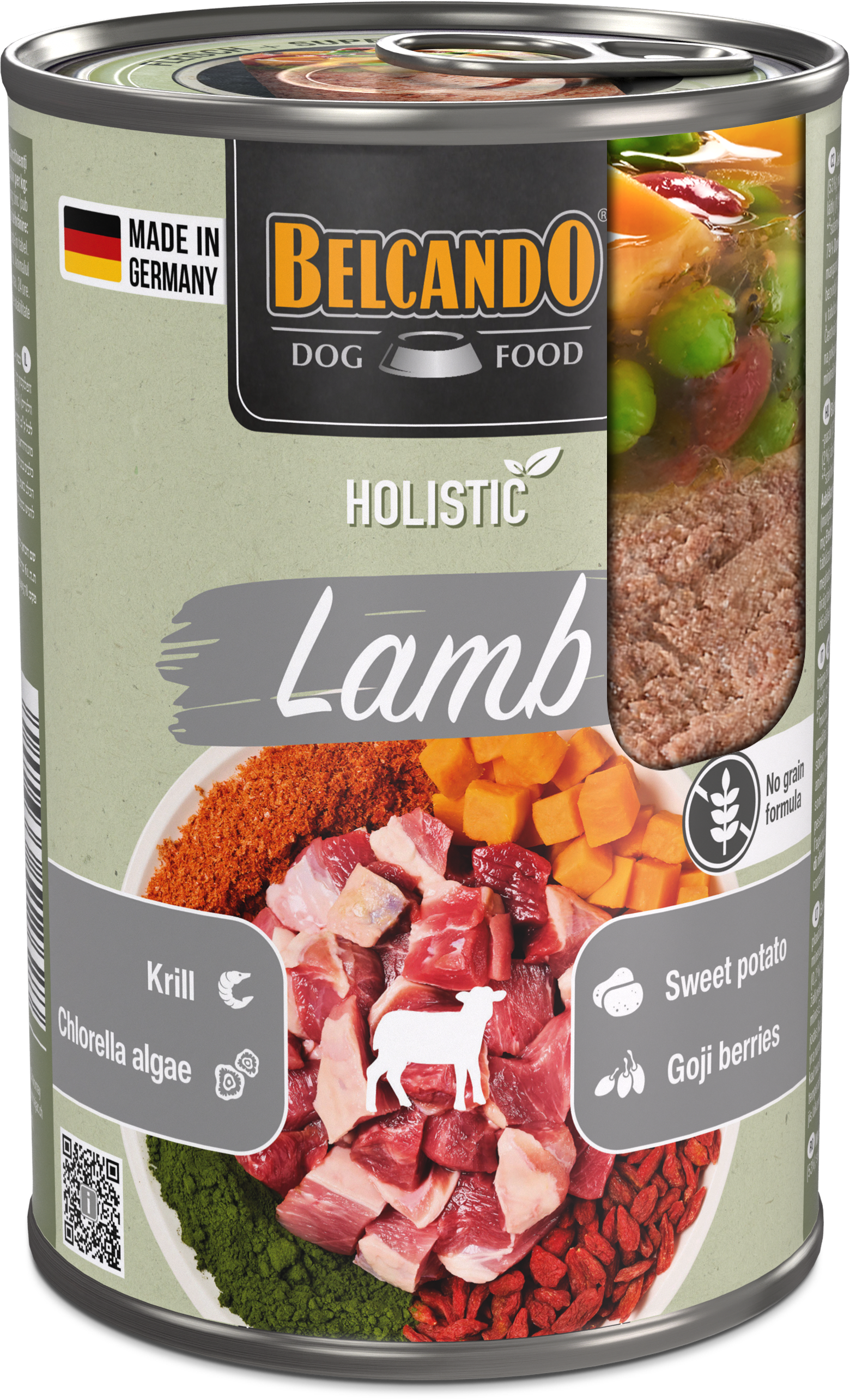 Composition: lamb, heart, liver, lung, tripe (53%); lamb broth 37.5%; sweet potato (3%); ground marine plankton (krill) (2.4%); pea (2%); minerals (1.1%); goji berries, dried (0.5%); eggshells, dried ((0.3%); algae (chlorella vulgaris) (0.2%)
