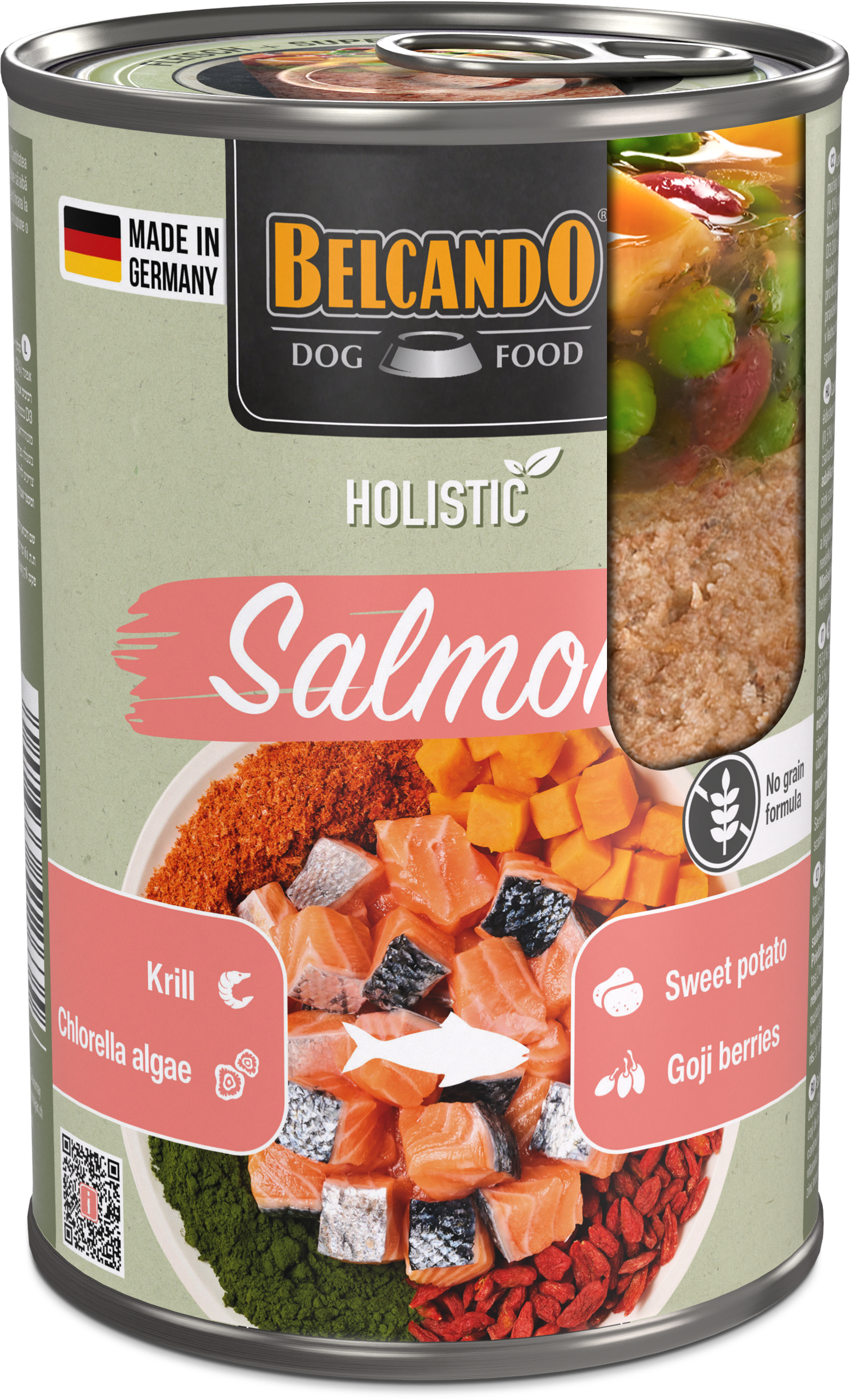 Composition: salmon (53%); salmon broth 37.5%; sweet potato (3%); ground marine plankton (krill) (2.4%); pea (2%); minerals (1.1%); goji berries, dried (0.5%); eggshells, dried ((0.3%); algae (chlorella vulgaris) (0.2%)