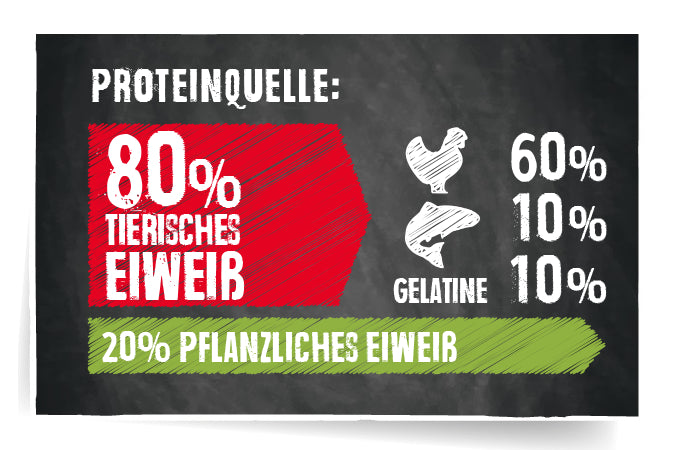 Animal protein share of total protein: 80 % (poultry 60%, fish/krill 10%, gelatin 10%).