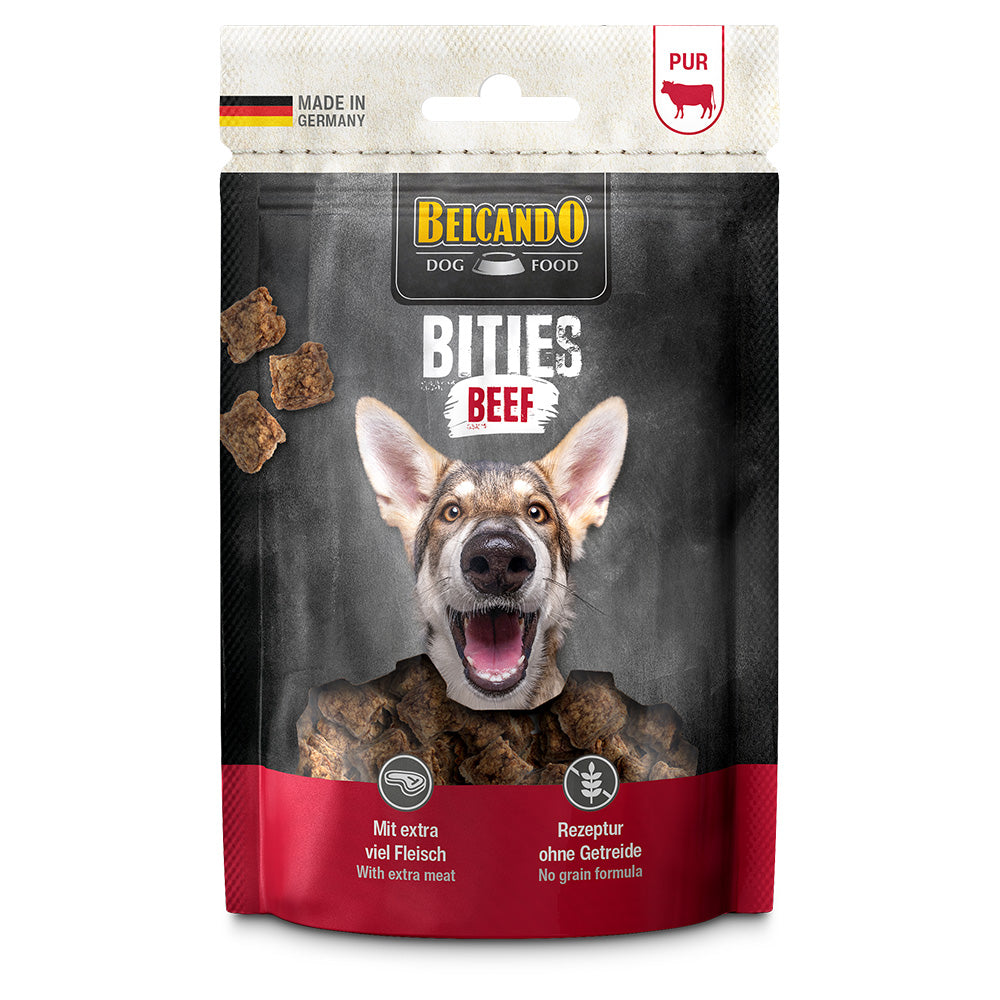 Belcando Bities, irresistibly delicious meat and joy in small pieces. The very meaty Bities treats are naturally "Made in Germany". The grain-free and sugar-free recipe is gently air-dried and uses a single animal as the source of animal protein.