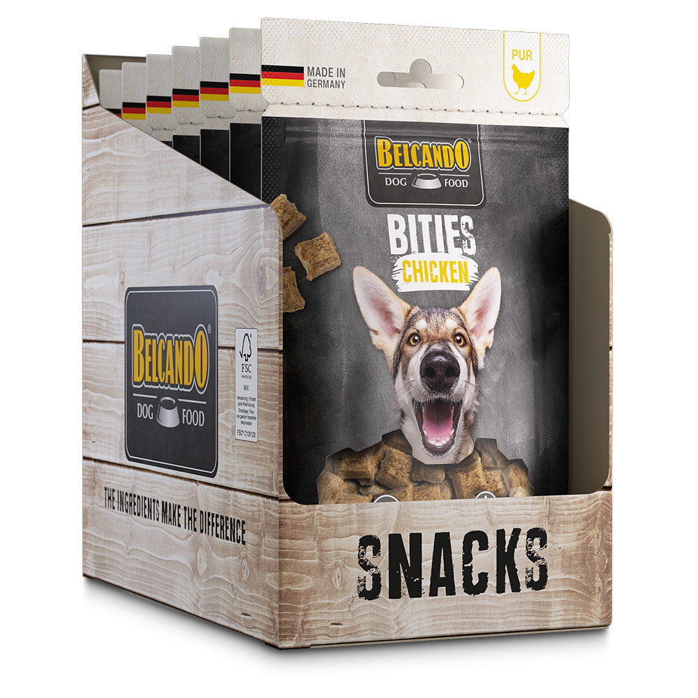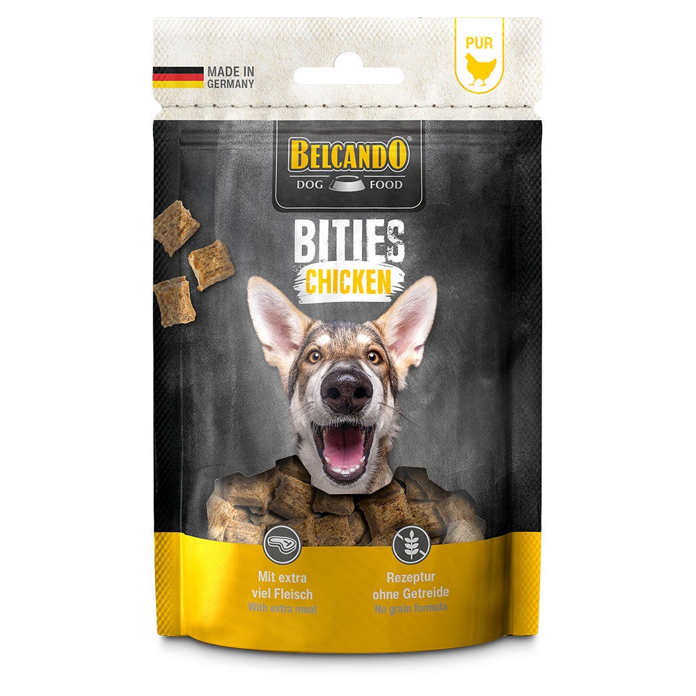 Belcando Bities, irresistibly delicious meat and joy in small pieces. The very meaty Bities treats are naturally "Made in Germany". The grain-free and sugar-free recipe is gently air-dried and uses a single animal as the source of animal protein.