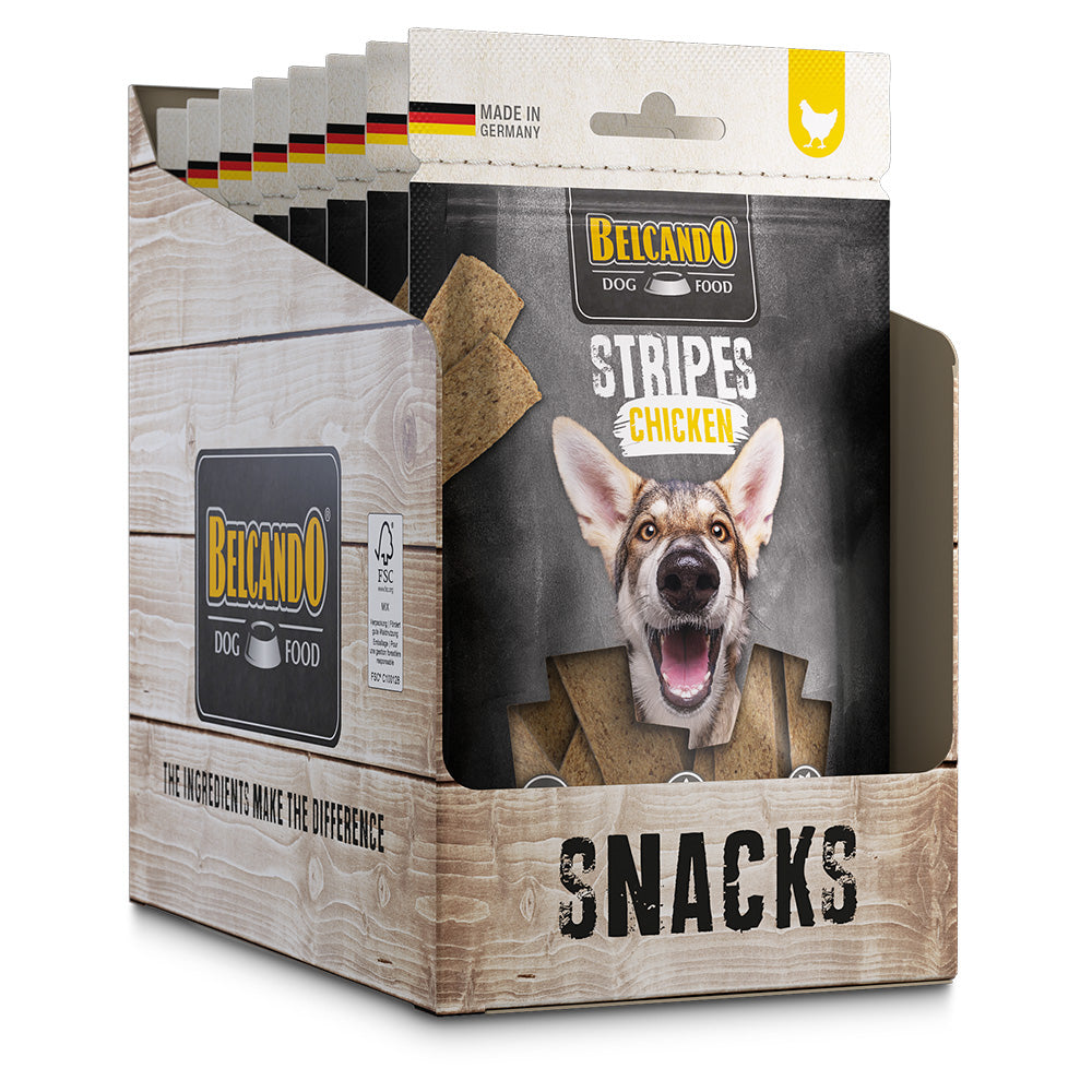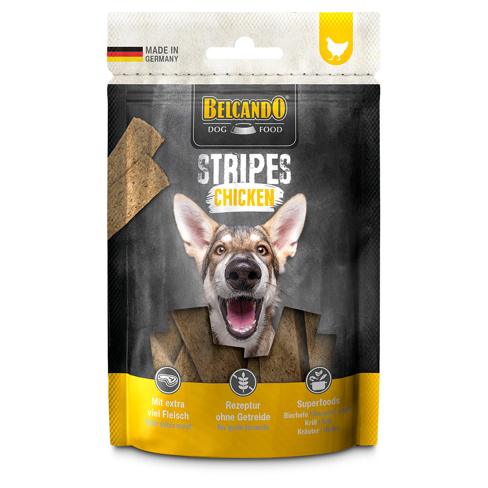 Belcando Stripes, irresistibly delicious meat and healthy superfoods (krill, yarrow and brewer's yeast). The very meaty Stripes treats are naturally "Made in Germany". The grain-free and sugar-free recipe is gently air-dried.