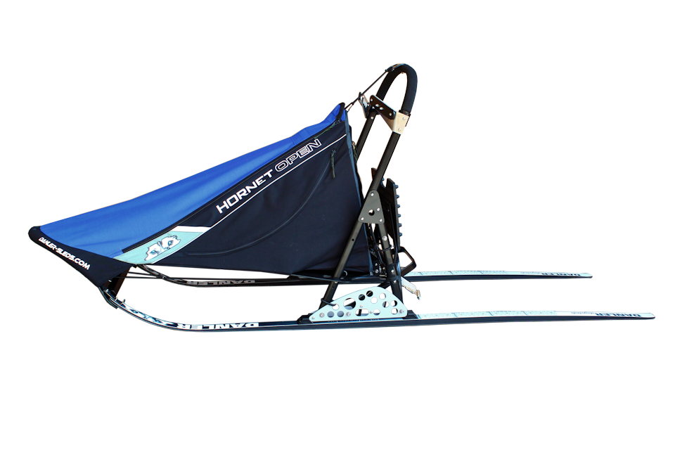 The sled's pull cord has loops at the front. The sled has redesigned lightweight and very easy-to-use anchor racks. However, the overall length remains the same as the Hornet XC sled and the Hornet Open sled uses the same skis as the Hornet XC sled.