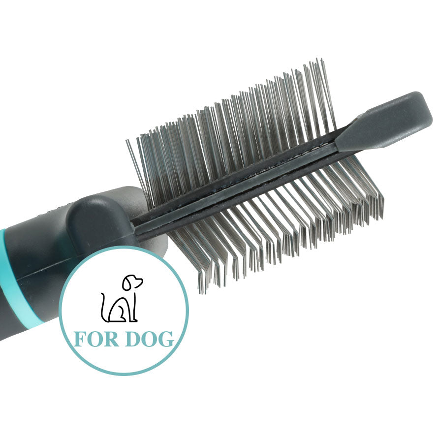 2-sided comb with comfortable handle and soft flexible bristles. Comb flexes in both directions