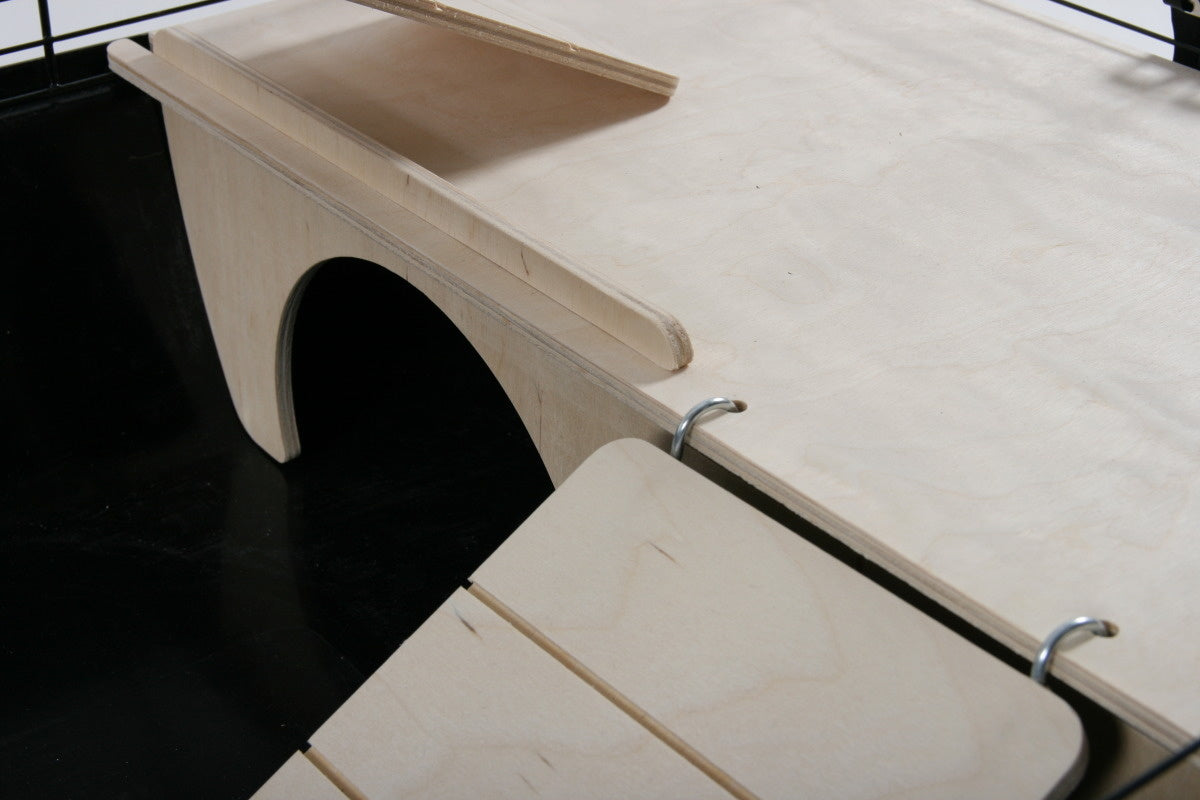 - Includes 1 platform, 1 ladder, 1 wooden house, 1 runner, 1 clear plastic bowl.