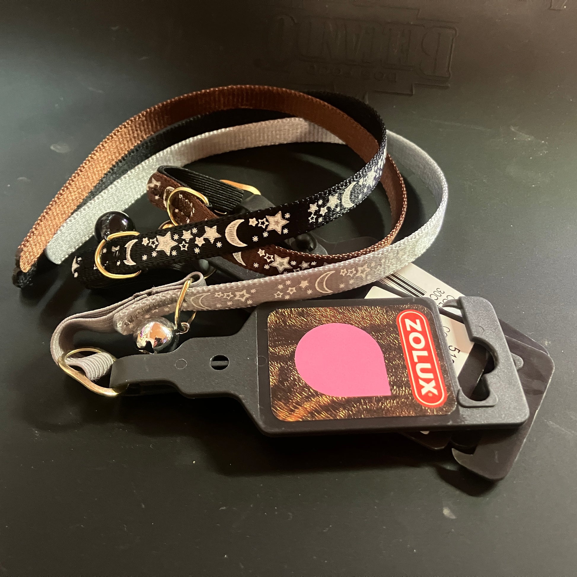 Kuminauhalla ja kilikellolla varustettu yötaivas -kuvioinen kissanpanta. Noin 30cm pitkä ja 10mm leveä. Väreinä harmaa, musta ja ruskea.