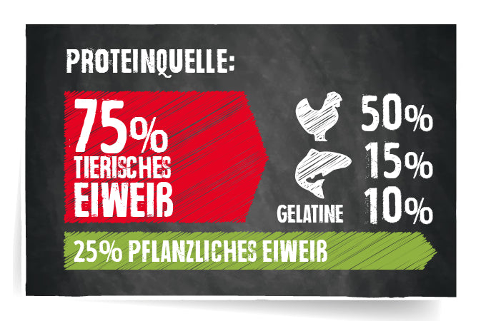 Eläinproteiinin osuus kokonaisproteiinista: 75 % (siipikarjaa 50%, kalaa/krilli 15%, gelatiini 5%)