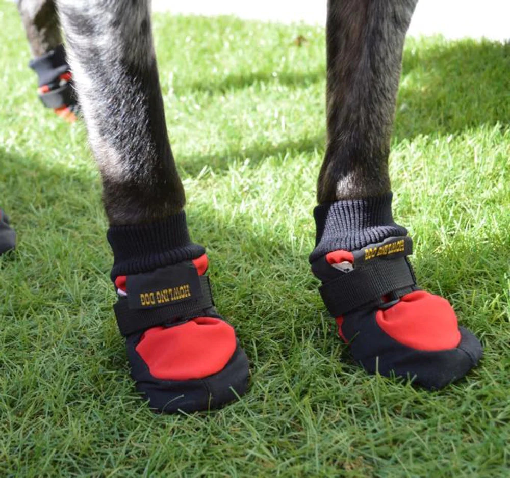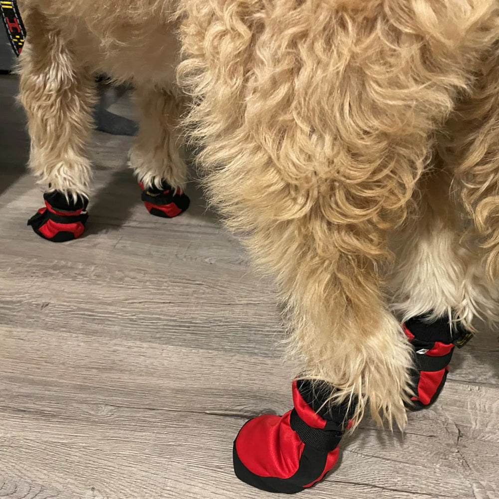 Huomaathan että tarran kiinnitys pitää olla tiukka/napakka. Jos tossut karkaavat jaloista, kiristä tiukemmalle tai valitse pienempi koko. Koiran liikkuessa tarra voi olla kireällä, mutta koiran ollessa paikoillaan/levossa kotona, autossa jne. tossut tulee heti ottaa pois jaloista tai kiinnitys pitää löystää.