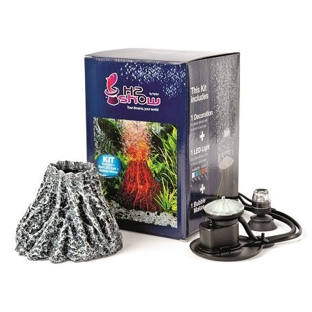 Paketti sisältää: 1 Käsintehty myrkytön hartsikoristelu tulivuori, joka sopii yhdistettäväksi värilliseen valoon ja kupliin upeiden tehosteiden saavuttamiseksi; 1 LED Show, erittäin turvallinen ja matalajännitteinen LED-valo, joka tuottaa värillisen valaistuksen; 1 Bubble Show, patentoitu sisäilmastimemme, joka on erityisesti suunniteltu hapen tehokkaaseen levittämiseen akvaarioissa.