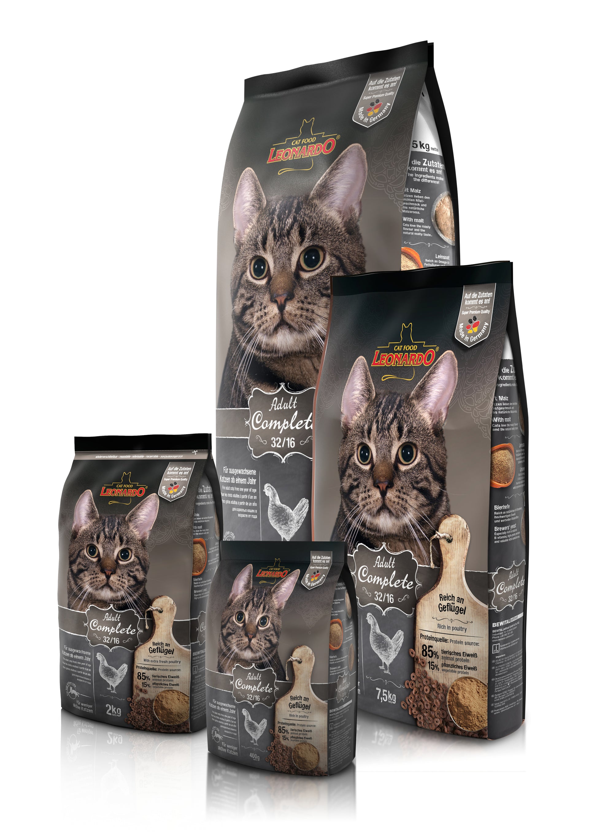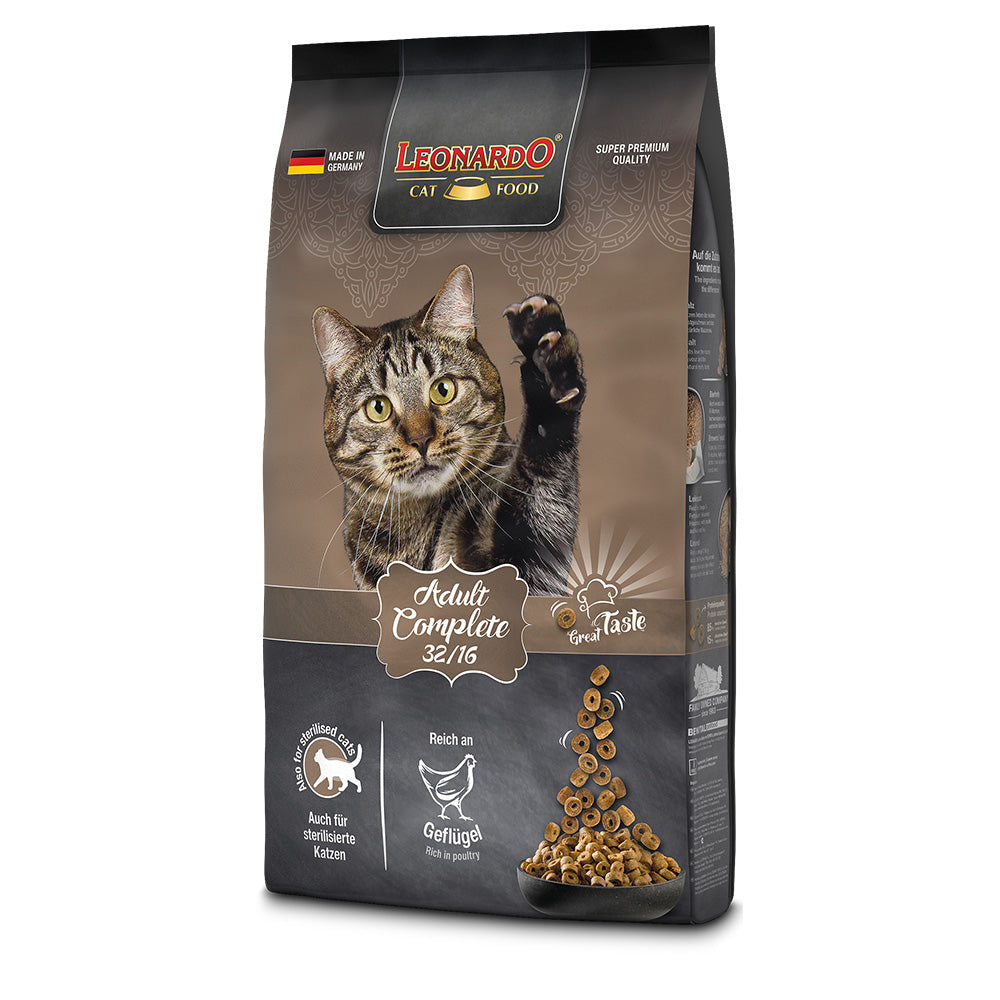 LEONARDO® Adult Complete 32/16, on maistuva aikuisruoka, joka sisältää rajoitetun määrän energiaa (rasvaa 16%) ja se soveltuu erityisesti kissoille jotka liikkuvat rajoitetusti.
