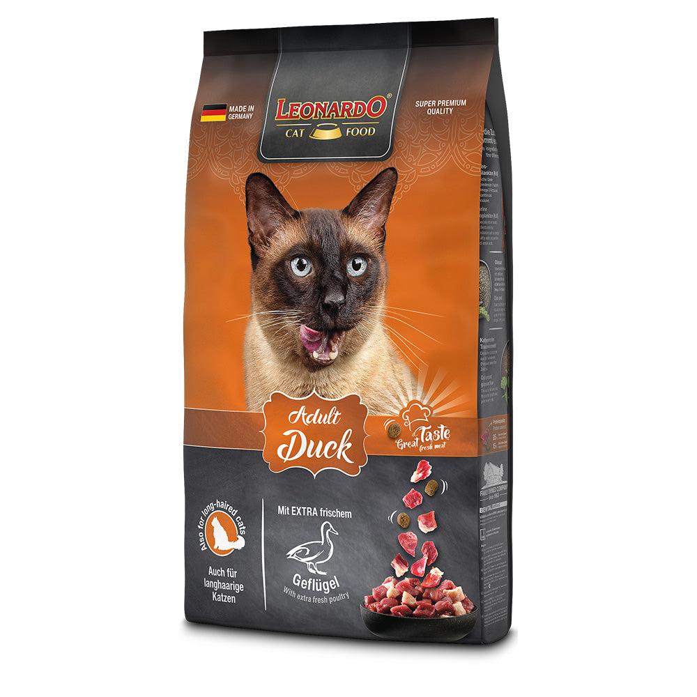 LEONARDO® Adult Duck on herkullinen makuvaihtoehto kissoille, jotka rakastavat ankkaa. Reseptiin on lisätty myös chian siemeniä sekä herkullista antarktiksen krilliä. Niiden korkea omega-3-rasvahappopitoisuus pitää lesitiinin kanssa huolta terveestä ihosta ja kiiltävästä turkista.
