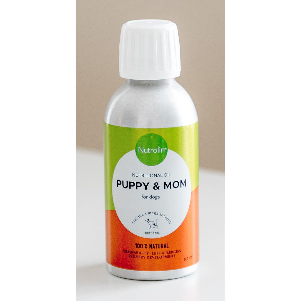 Nutrolin® Puppy & Mom:ia annetaan emolle astutuksesta tai tiineyden loppukolmanneksesta alkaen imetyksen päättymiseen. Pennuille öljyä annetaan siitä lähtien kun ne siirtyvät kiinteään ruokaan. Öljyn antamista jatketaan vähintään 6 kk ikään saakka. Jos pentusi on tuleva urheilu- tai työkoira, Nutrolin® Puppy & Mom:ia on hyvä antaa noin vuoden ikään saakka.