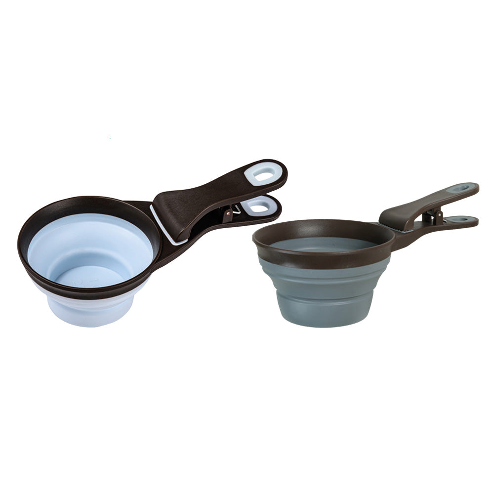 2in1 mittakuppi. Saatavilla 2 kokoa M=237ml ja L=473ml. Silikoninen mittakuppi taittuu kasaan ja mittakupin kahvassa olevalla nipistimellä suljet kätevästi lemmikin ruokapussin.