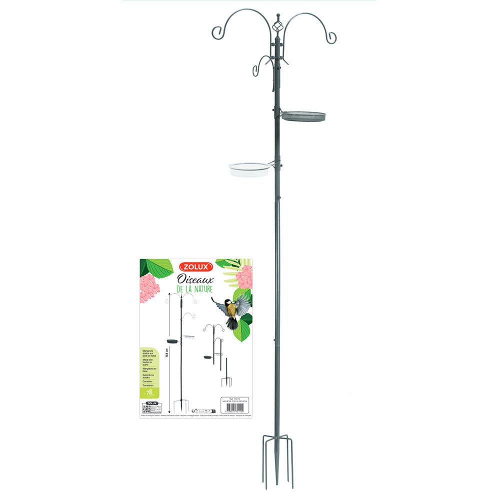Metallinen lintujen ruokinta-asema korkeus 188cm. 3 koukkua ja 2 astiaa
